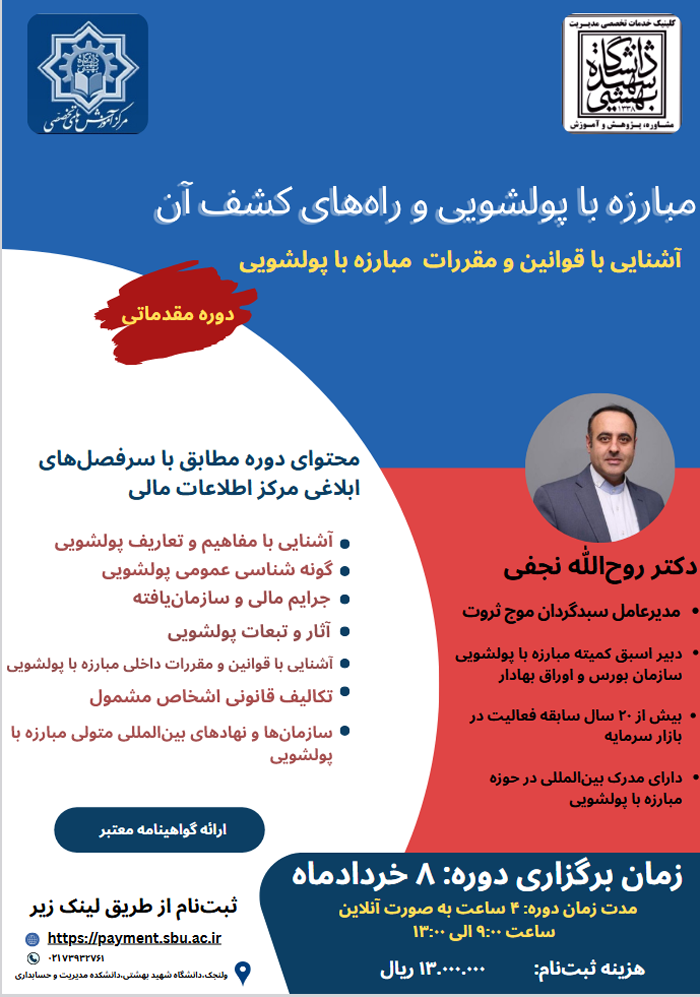 در صورتی که تمایل دارید در دوره مبارزه با پولشویی و راه‌های کشف آن که در دانشگاه شهید بهشتی به صورت آنلاین برگزار می‌شود شرکت کنید لطفا از طریق زیر اقدام فرمایید.