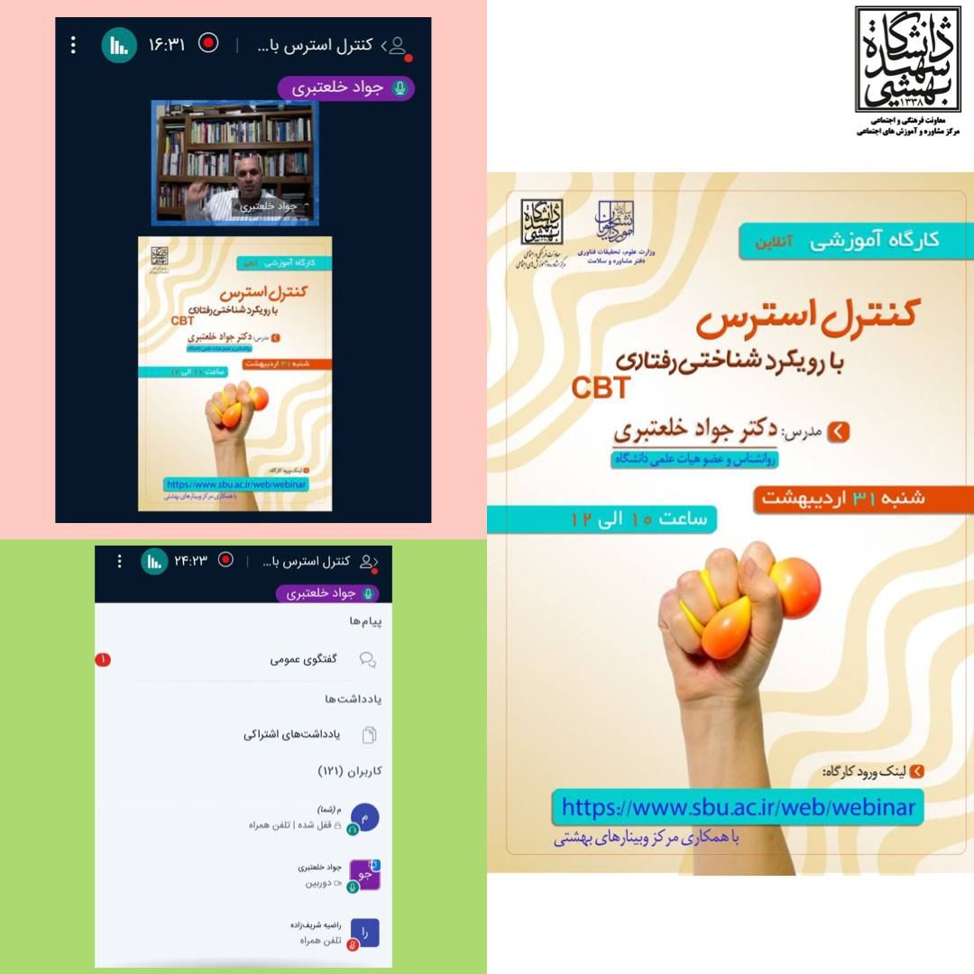 🏢مركز مشاوره و آموزشهاي اجتماعي برگزار كرد👩‍💻👨‍💻كارگاه آموزشي انلاين كنترل استرس با رويكرد CBT🧑‍🏫مدرس: آقاي دكتر جواد خلعتبري ( روانشناس و عضو هيات علمي دانشگاه )لازم به ذكر است اين كارگاه آموزشي ديروز ٣١/٢/١٤٠١ با استقبال پرشور دانشجویان و دانشگاهیان عزيز برگزار شد.
