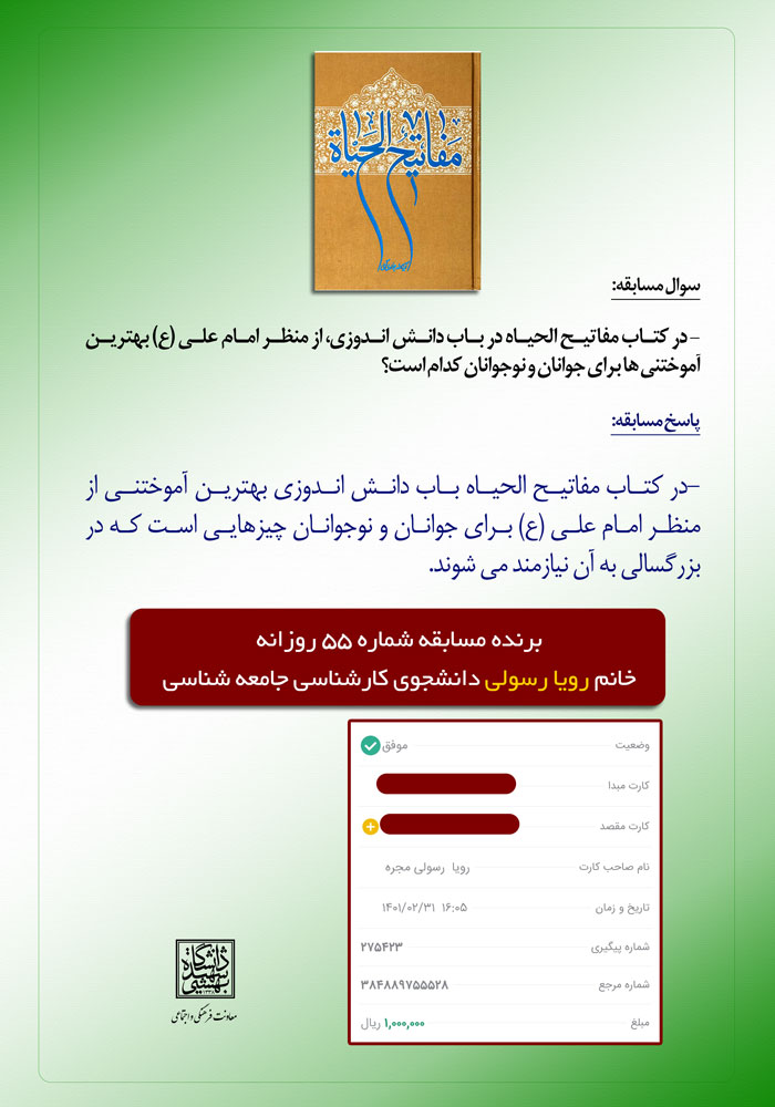 پاسخ مسابقه: در کتاب مفاتیح الحیاه باب دانش اندوزی بهترین آموختنی از منظر امام علی (ع) برای جوانان و نوجوانان چیزهایی است که در بزرگسالی به آن نیازمند می شوند.