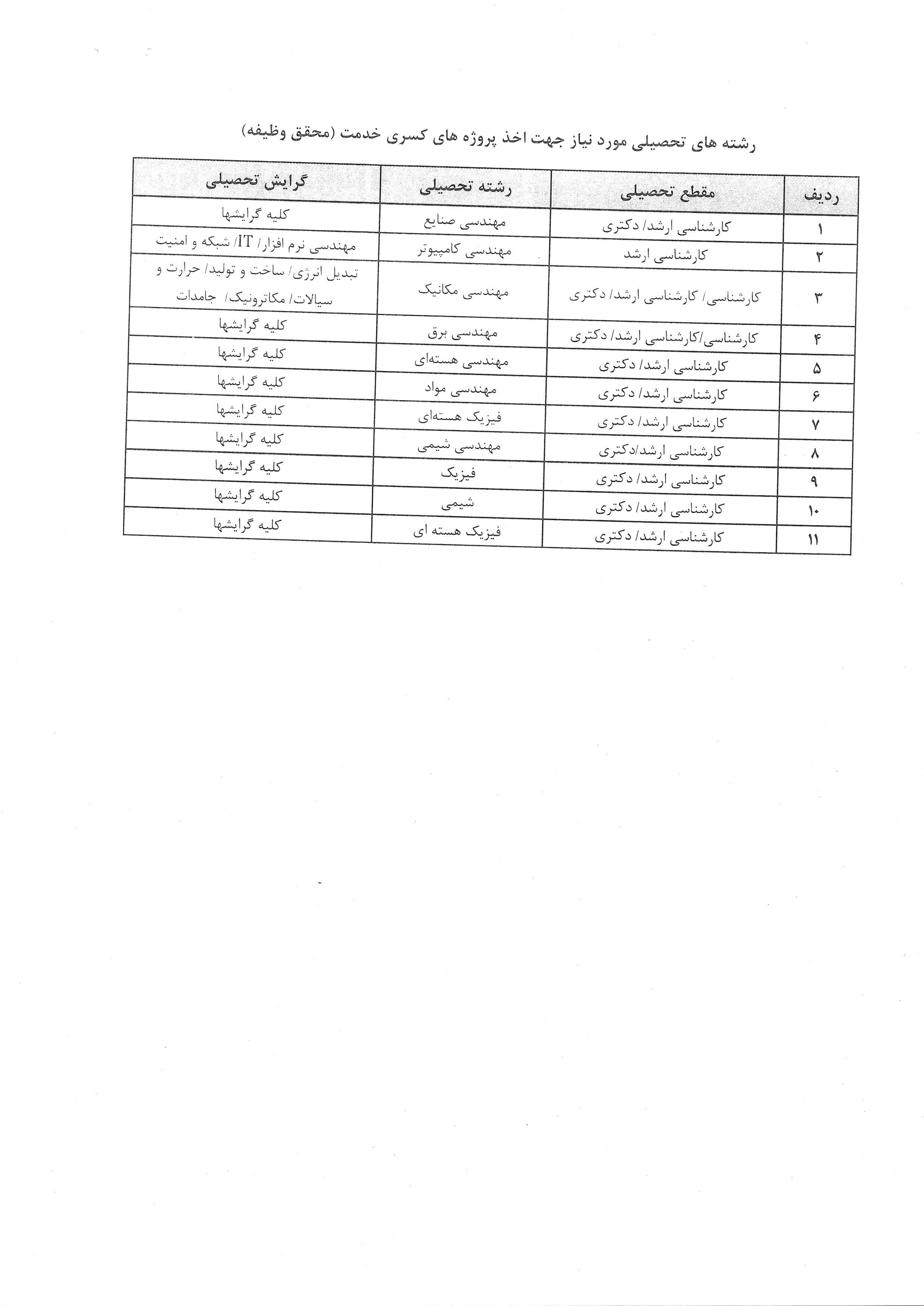 رشتههای مورد نیاز پروژههای کسری خدمت