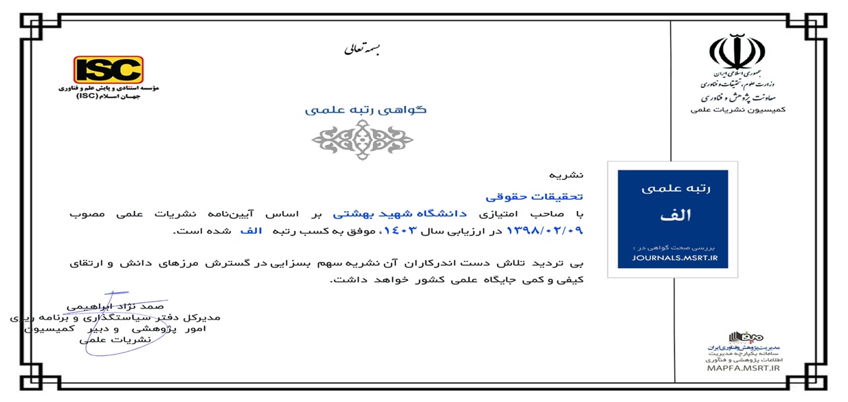 فصلنامه تحقیقات حقوقی موفق به کسب رتبه علمی "الف" شد.