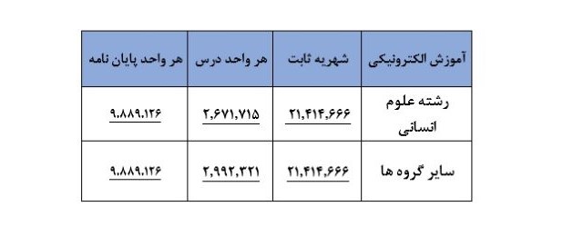جدول شهریه بر حسب ریال (ورودیهای 1400)
